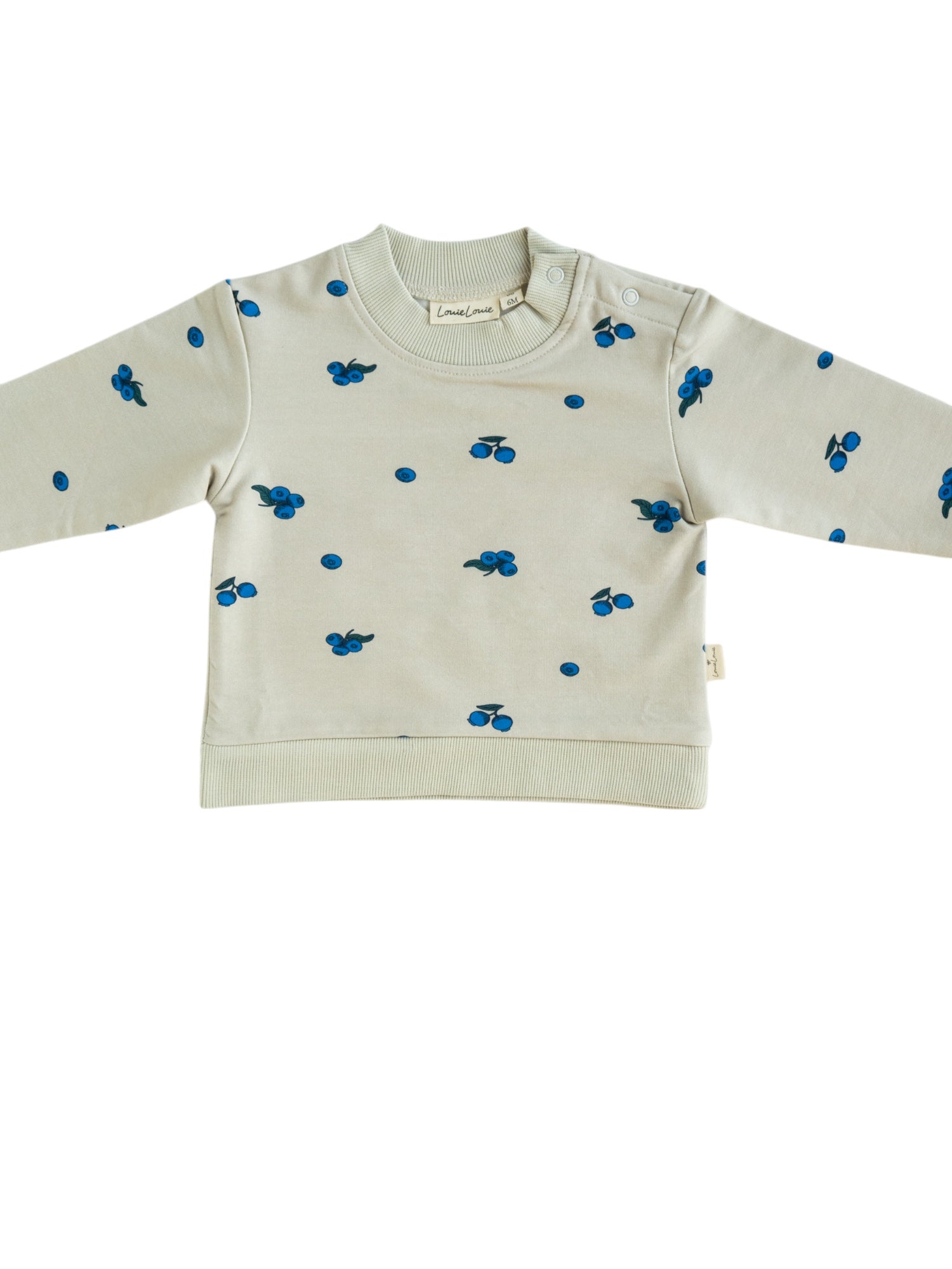 Blød og varm sweatshirt i økologisk jerseybomuld med blåbærprint. Blusen har trykknapper ved venstre skulder, hvilket gør den nem at tage af og på. Den bløde og strækbare kvalitet gør blusen ideel til både leg, afslapning eller hygge.