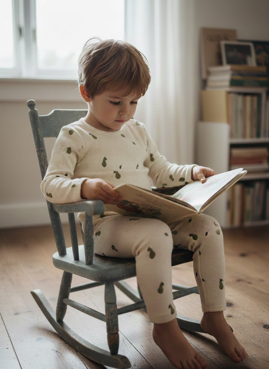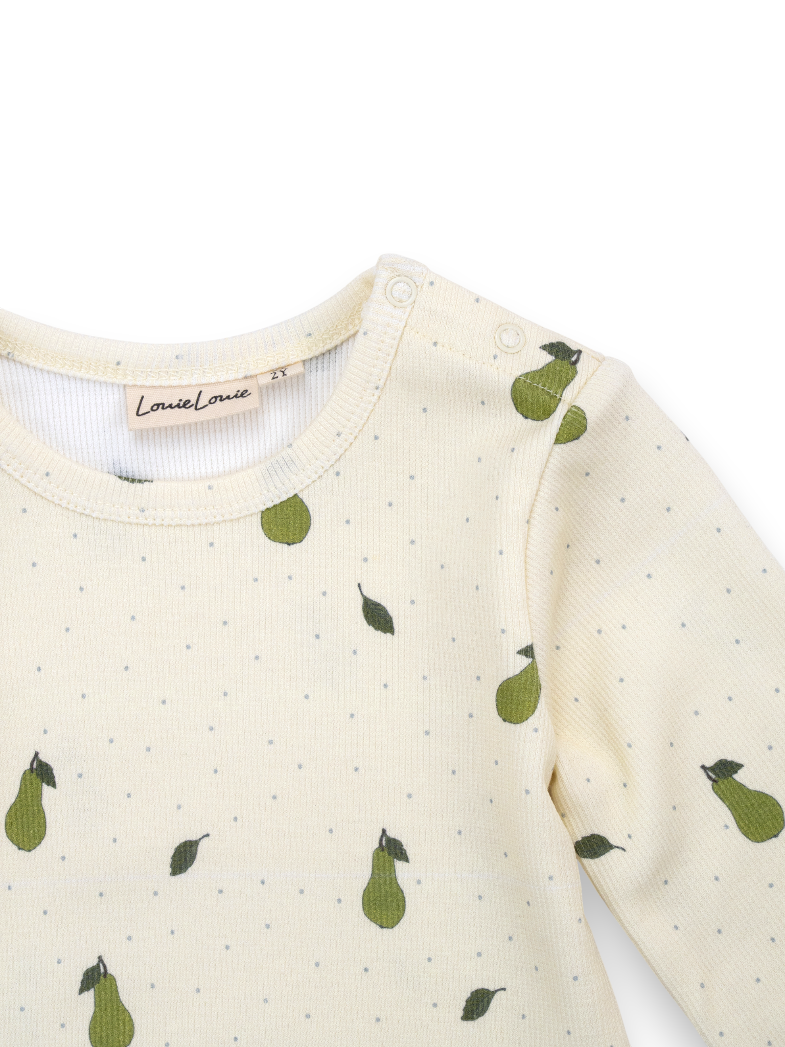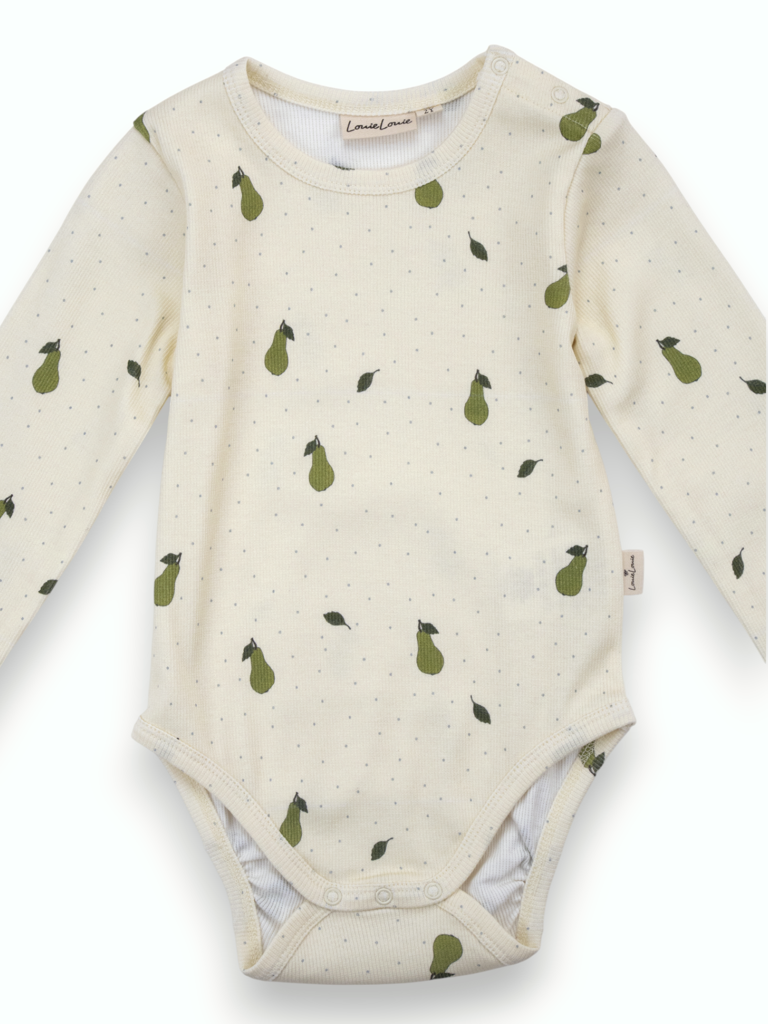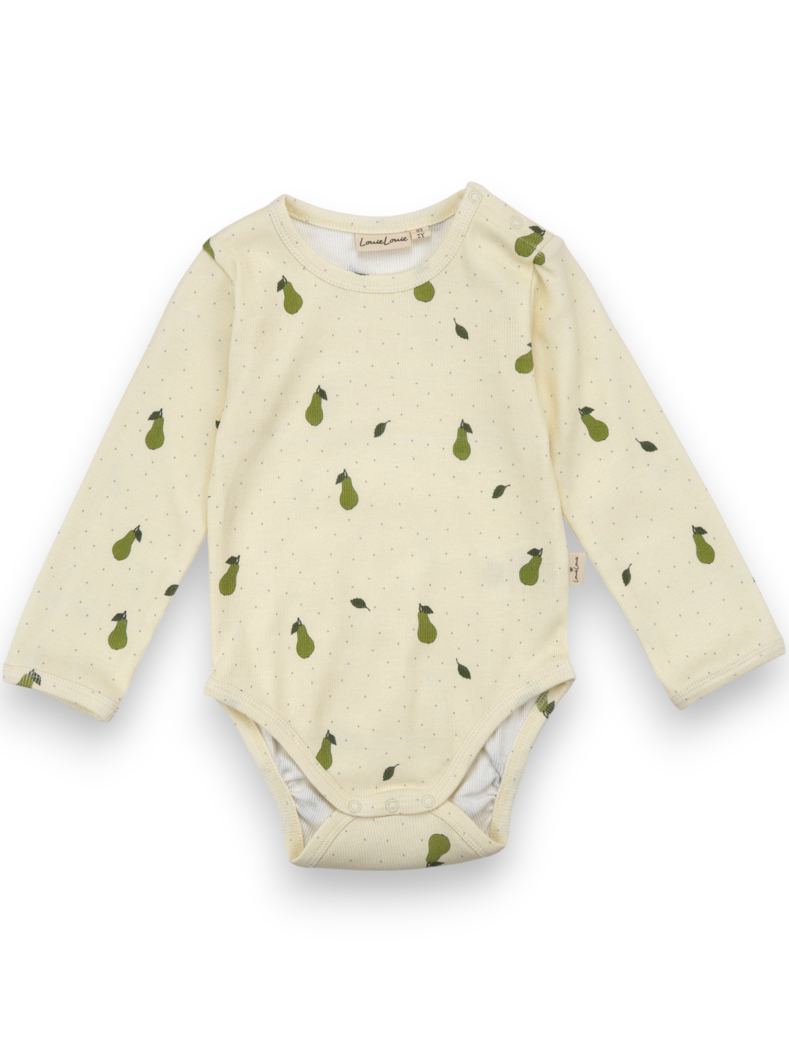 Langærmet rib bodystocking med pærer og blade i ultra blødt økologisk rib bomuld, der giver ekstra strækbarhed på grund af rib-materiale. Bodystockingen har trykknapper ved venstre skulder samt i bunden, mellem benene, så bleskift er praktisk.